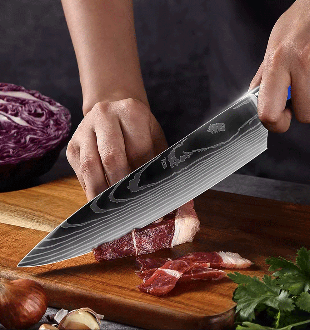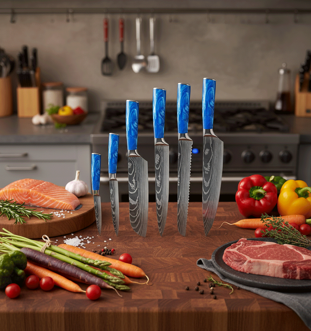 Set-Inhalt: 4 Zoll Schälmesser, 5 Zoll Allzweckmesser, 7 Zoll Santokumesser, 8 Zoll Tranchiermesser, 8 Zoll Brotmesser, 8 Zoll Kochmesser
