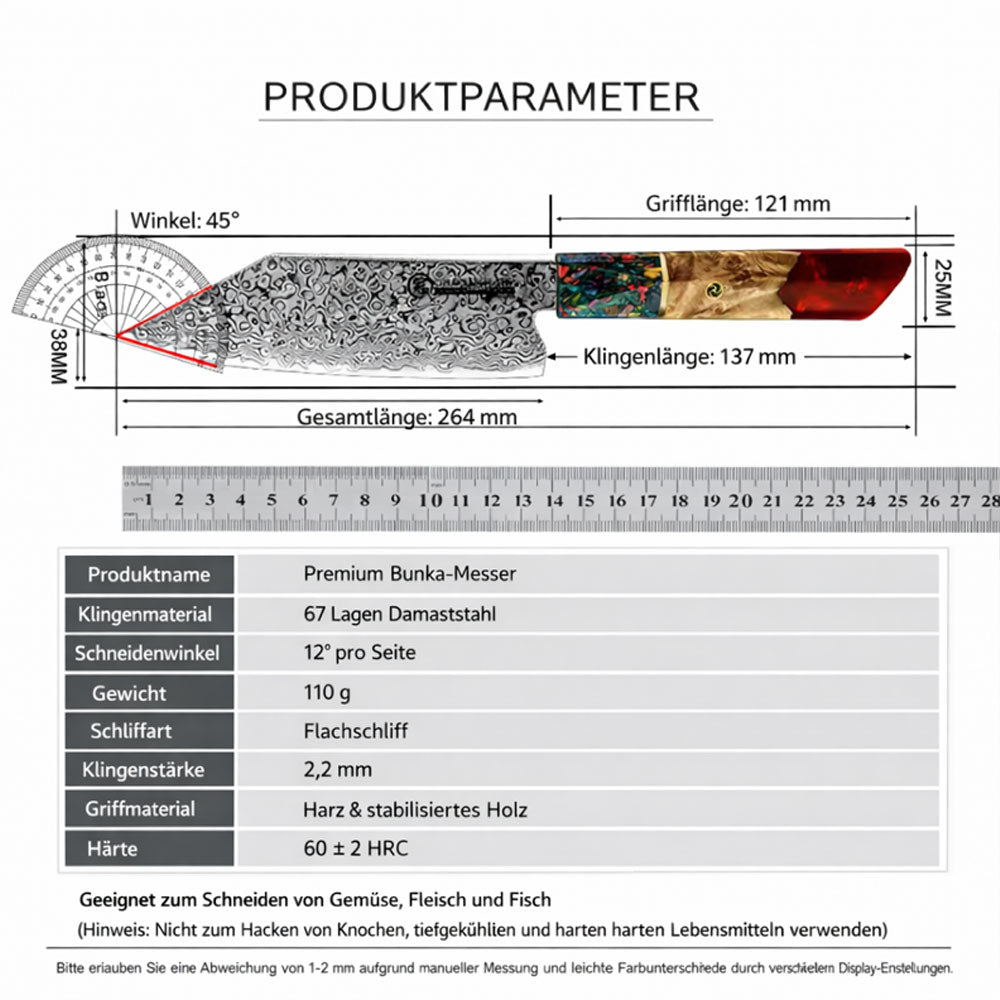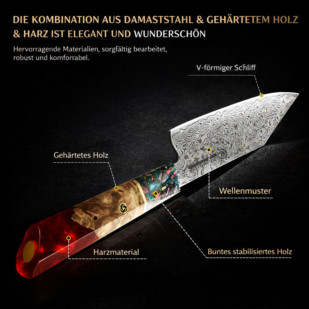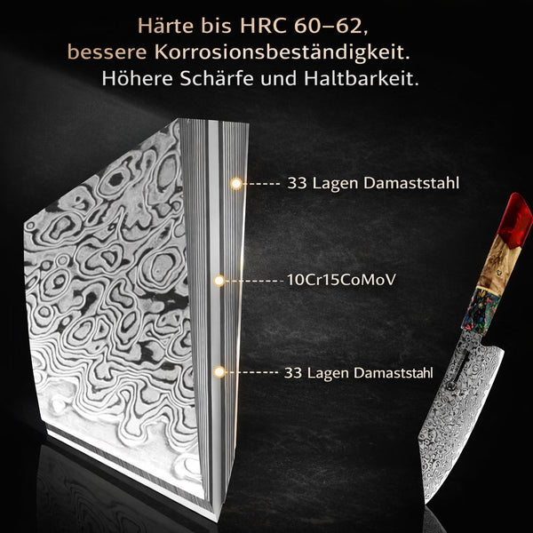 Das hochwertige Damaststahl sorgt dafür, dass die Klinge lange scharf bleibt. Sie müssen sich nicht mehr über stumpfe Klingen ärgern und können sich auf Ihre Kochkünste konzentrieren, ohne ständiges Nachschärfen.